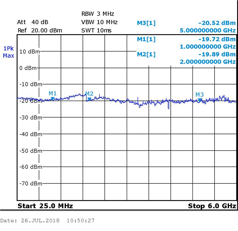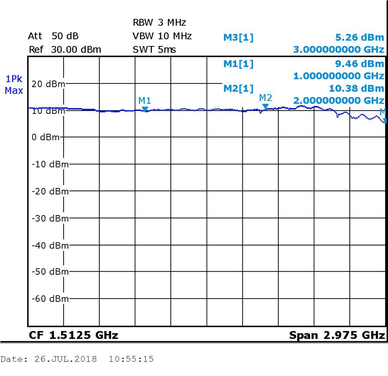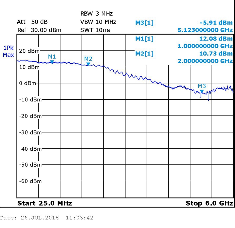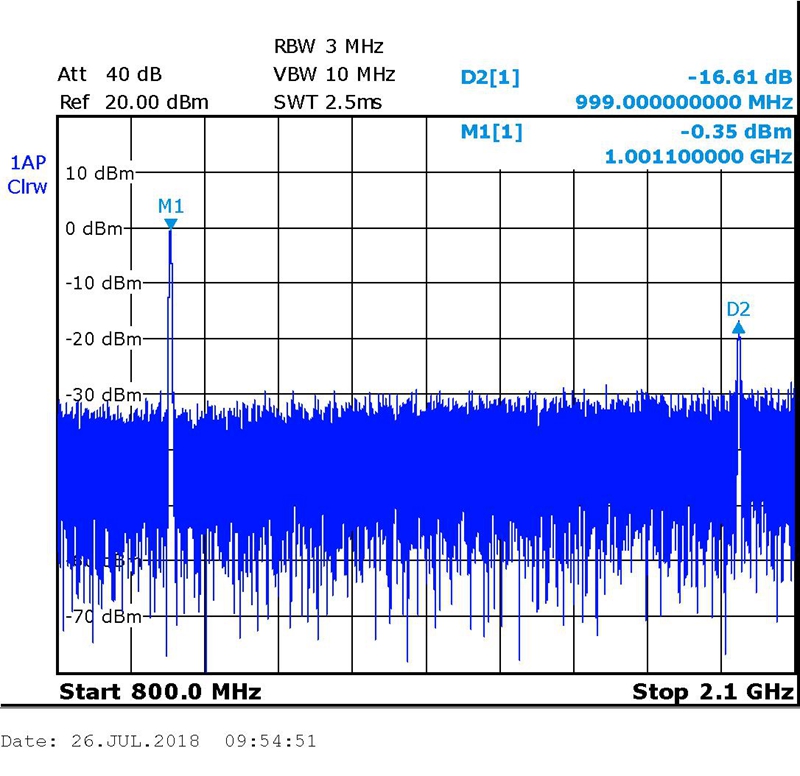 1.Harmonic analysis, output signal 1GHz, amplitude 0dBm output, second harmonic is 16.61dBc at 2GHz, third harmonic is 17.68dBc at 3GHz.