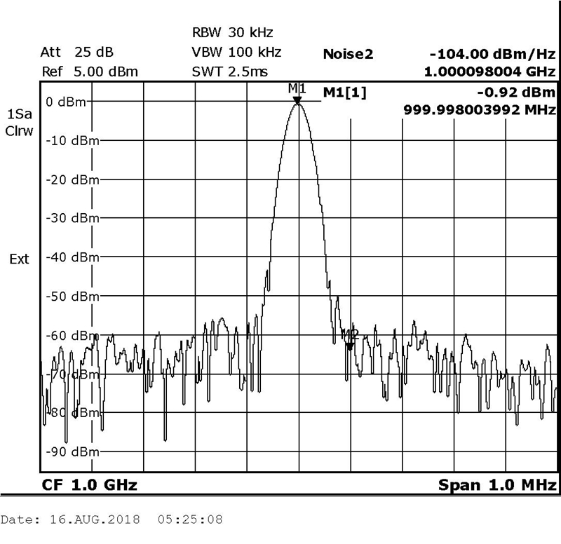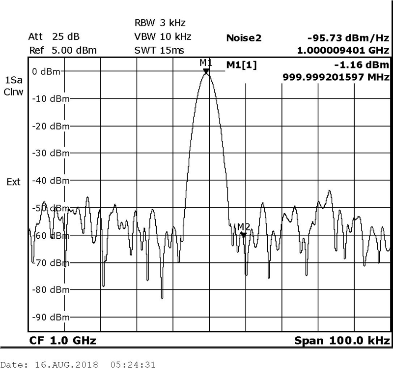 2.Analysis of phase noise, when the output signal is 1GHz and the amplitude is 0dBm, the phase noise = -95.73dBm/Hz@10KHz
