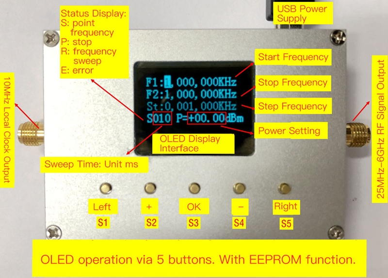 This is a wide-band practical handheld simple RF signal source, which is displayed on a computer host computer and integrates a high-performance frequency synthesizer and amplitude control unit (already calibrated) to ensure high performance. Small size, low power consumption and cost-effective performance.