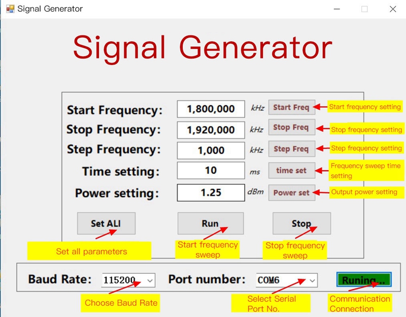 The interface of host computer is shown in the figure below. You can set the start frequency, stop frequency, sweep step, step time, power setting, set all parameters with one button, run sweep, stop sweep.