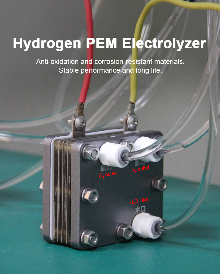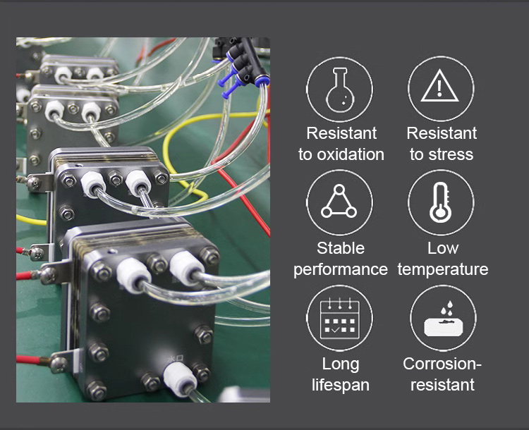 The product adopts aluminum alloy outer end plate, food-grade silicone seal and titanium material accessories. Internally encapsulated proton exchange membrane electrode for Nafion is used.