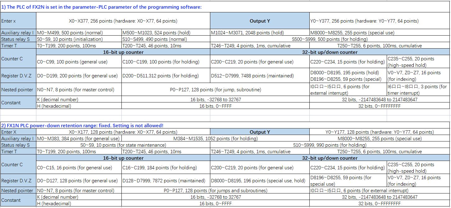 3) Application instructions: program flow, transmission and comparison, four logical operations, circular displacement, data processing, high-speed processing, convenient instructions, peripheral instruction I/O, peripheral equipment SER, floating point numbers, positioning, clock operations, peripheral equipment, contacts compare