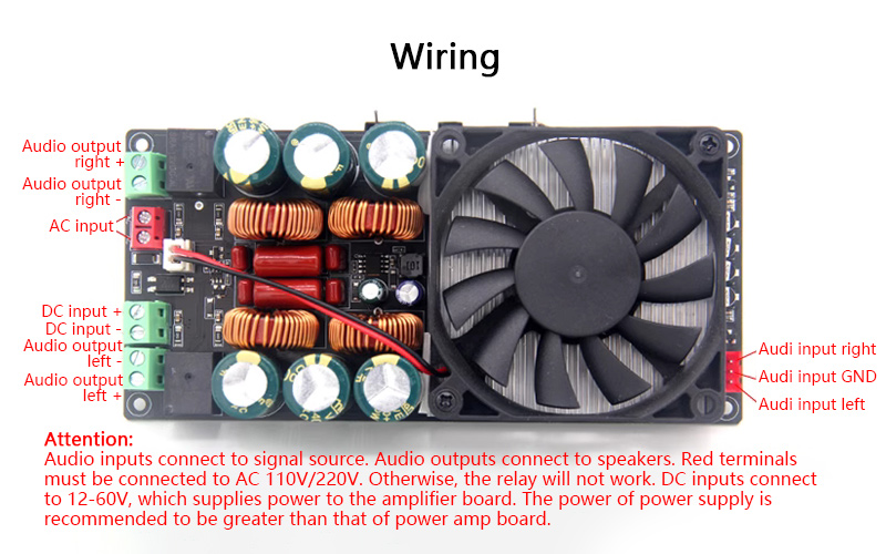 - Red terminals must be connected to AC 110V/220V, which supplies power to the relay. Completely isolated from the power amplifier part. Safe and secure to use.