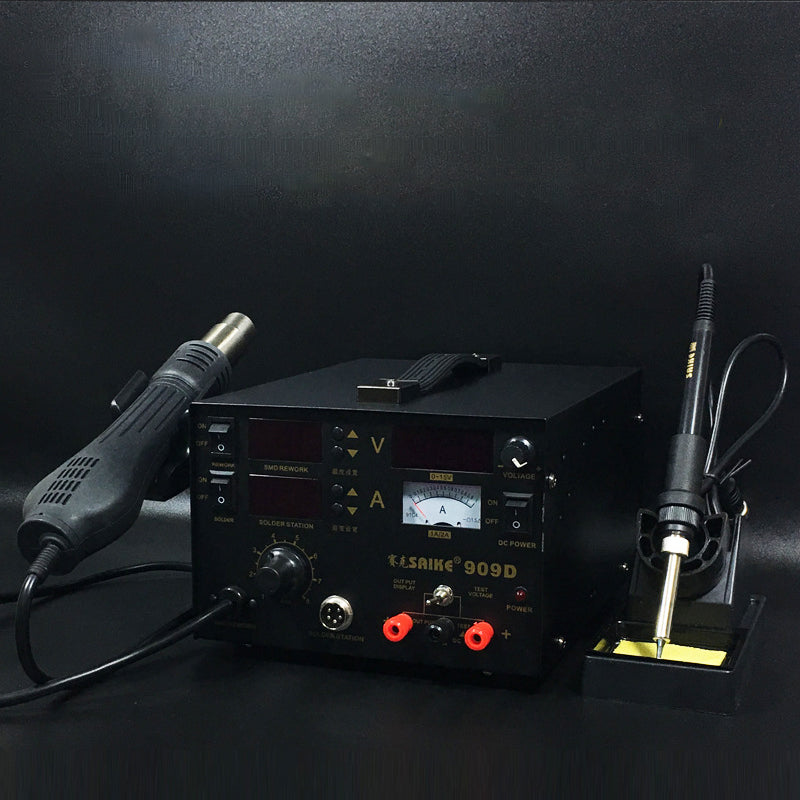 - SAIKE-909D is a three-in-one multi-tool tool specially designed according to the needs of the market. It combines common tools (welding station, heat gun, mobile phone repair power supply). The three functions can be switched on or off simultaneously. It occupies less work surface, saves energy and is further improved in performance on single-function products on the market.