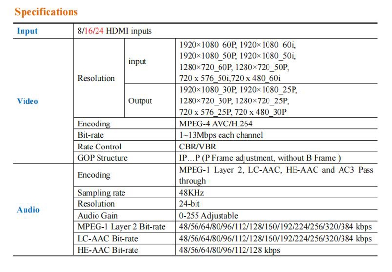 - Support 24 HDMI-compatible inputs, with 24 SPTS MPTS output max 24 HDMI-compatible inputs.