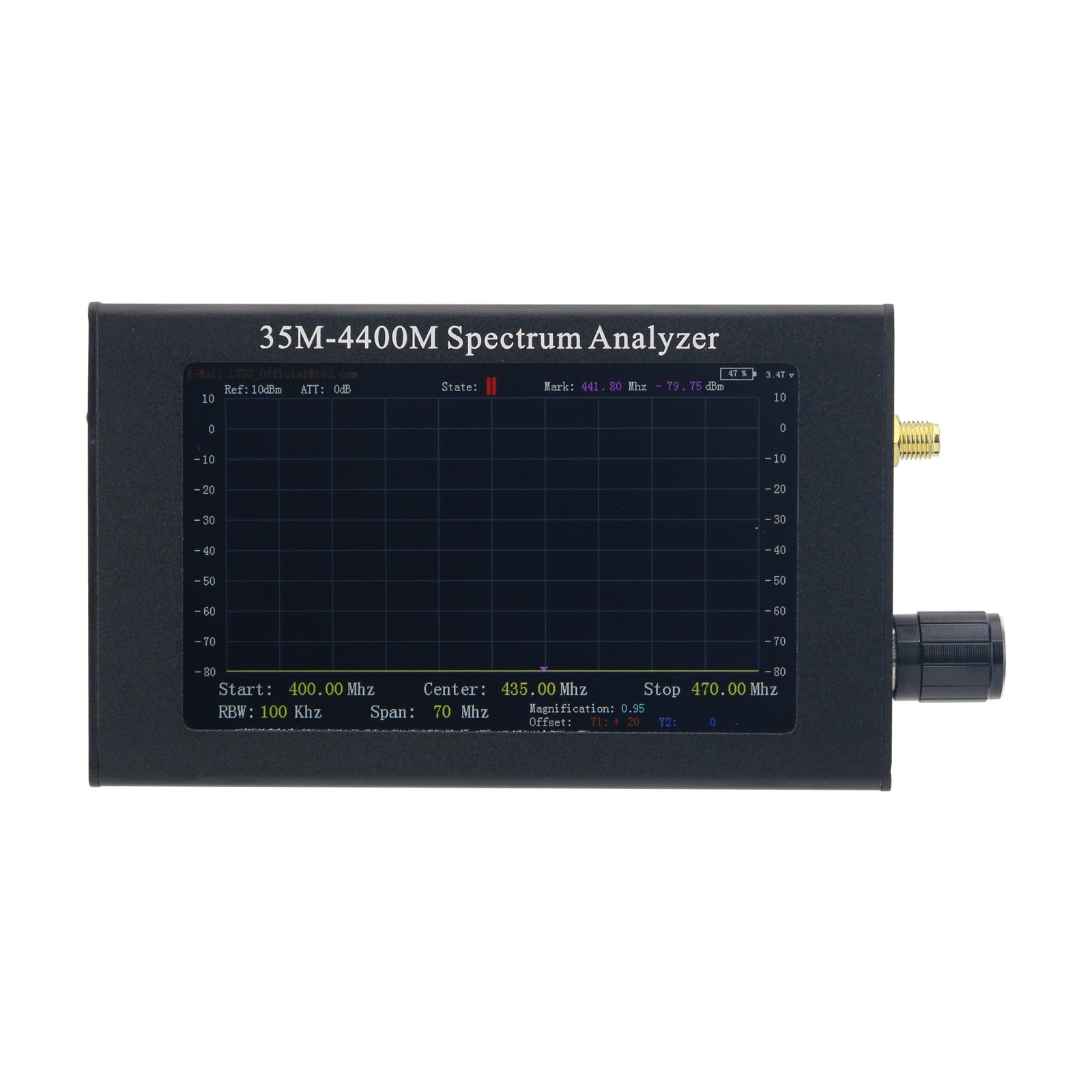 - Spectrum display range: 35M-4400Mhz; input impedance: 50 ohms.