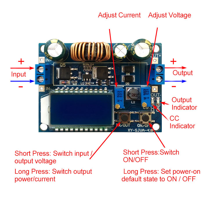 1.The module has two buttons IN / OUT, ON / OFF. IN / OUT button switches input voltage and output voltage display. Press and hold this button to switch output current and output power display.