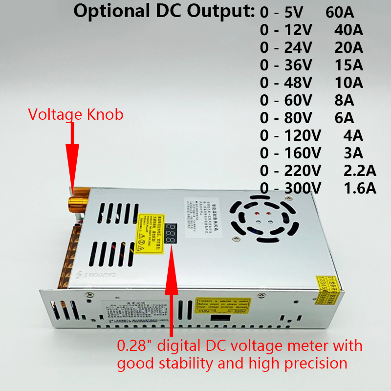 0-300V 1.6A (can be adjusted to 305V); 4-digit display