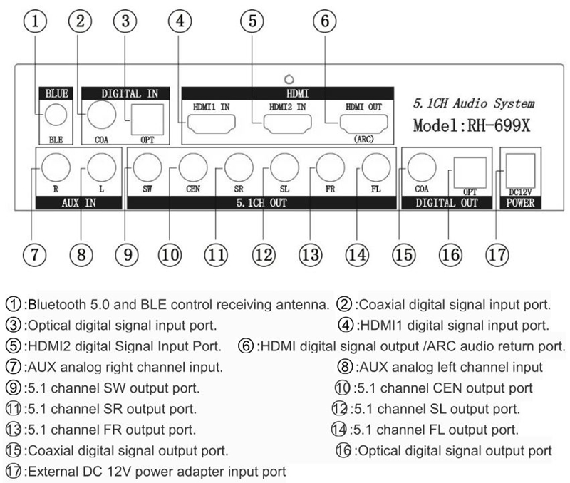 1: Supports one digital coaxial input, one digital optical fiber input, two HDMI inputs, one ARC audio return input, one AUX analog stereo input, one Bluetooth 5.0 input and one USB2.0 interface input. Different signal sources can be switched freely.