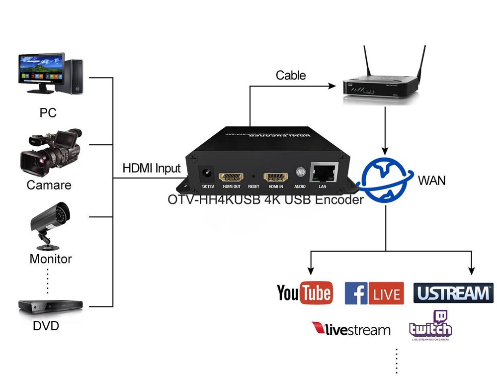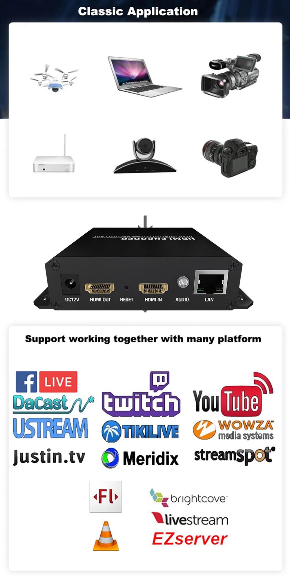 - It has high integration and cost-effective design make this device widely used in the variety of field such as CATV digital head-end, hotel IPTV system, live streaming broadcast, streaming media server etc. Also, the encoder works with the online live broadcast platform for YouTube, Ustream, Twitter, WOWZA, Facebook Live, etc.
