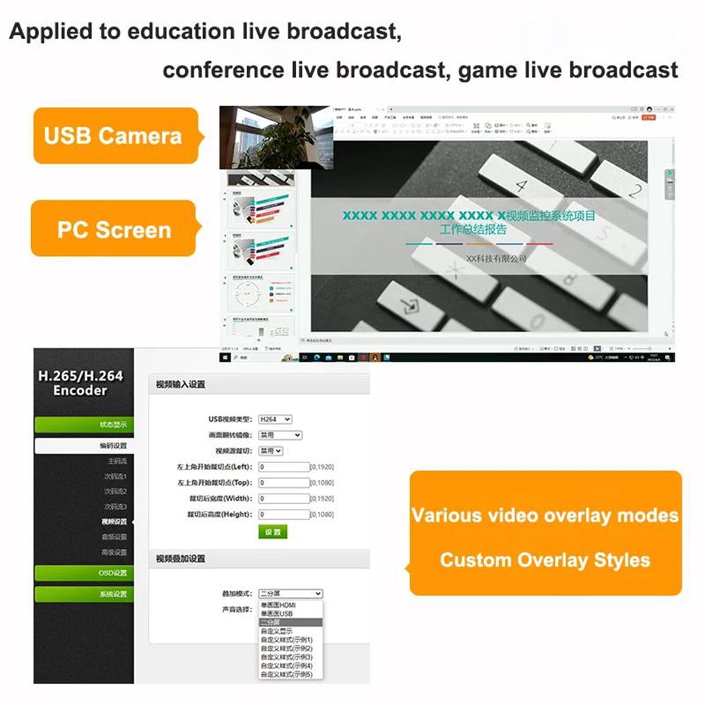 - Functions: live streaming, monitoring NVR recording, IPTV live streaming, LAN live streaming, low latency transmission, OSD settings.