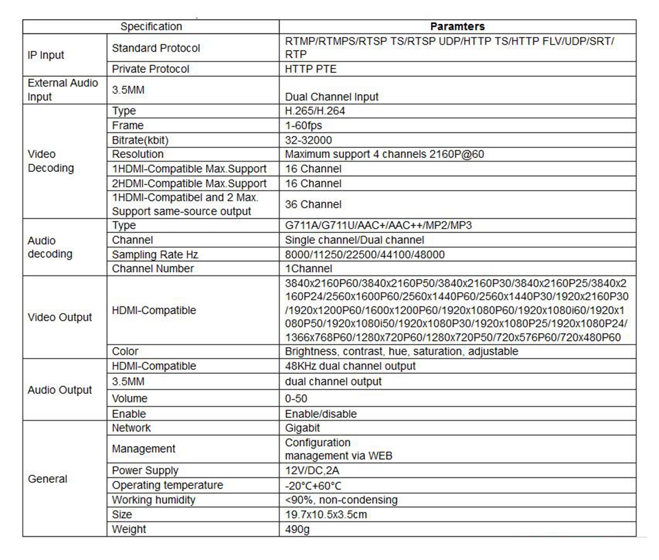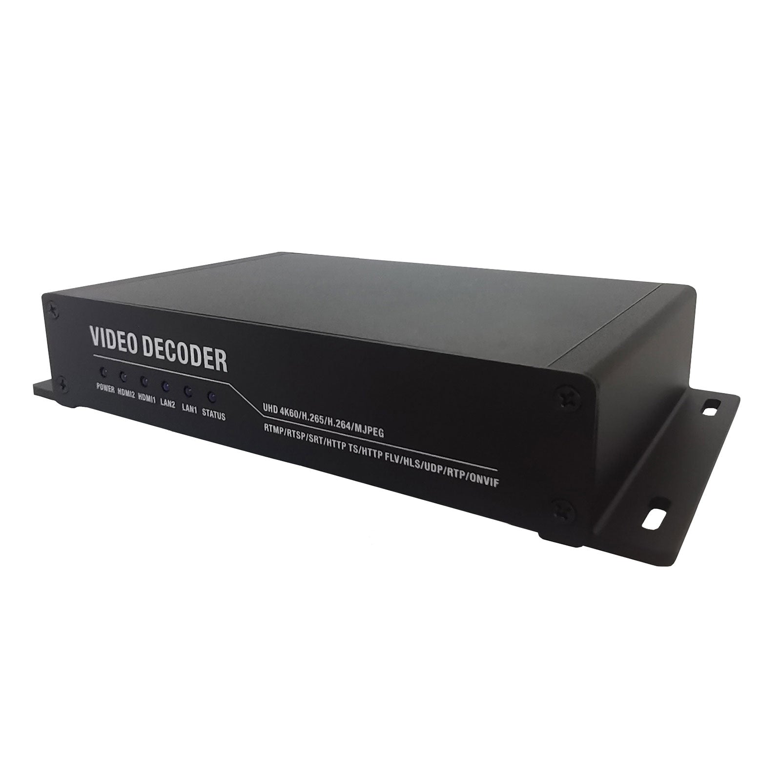 - It is a professional UHD H.265/H.264 4K streaming decoder with 2 channel HDMI-compatible output, which used advanced H.265 video compression technology, integrated data transmission over RTMP/RTMPS/RTSP TS/RTSP UDP/HTTP TS/HTTP FLV/UDP/SRT/RTP with embedded operating system.