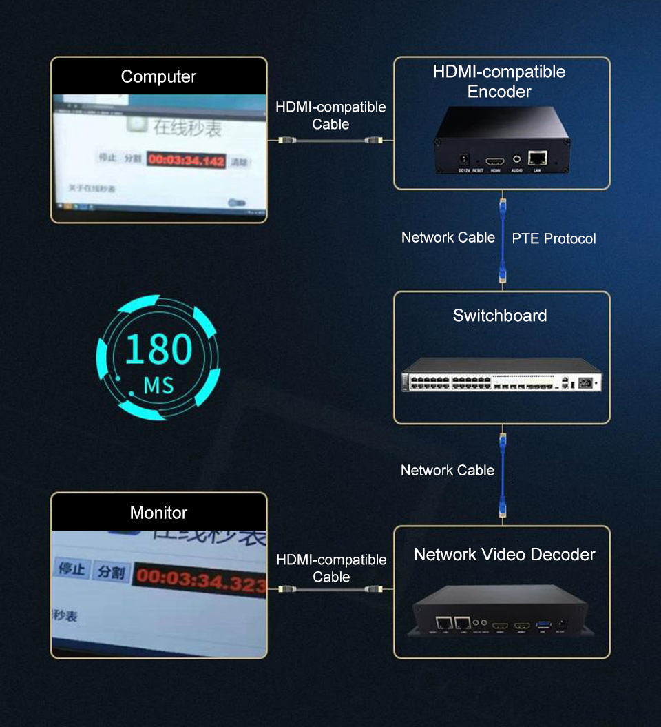 - Low latency: encoder paired with decoder low latency transmission delay range: 80-200 milliseconds; Tested encoder with decoder delay: 180MS.