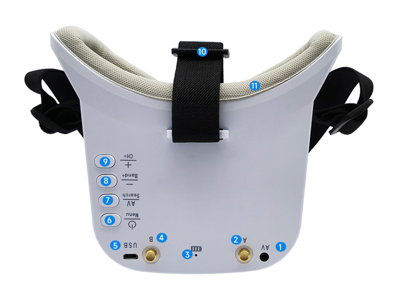 * AV: Press and hold this button to switch between FPV video mode (default) and AV external video input mode. The external video input signal must be CVBS, NTSC or PAL.