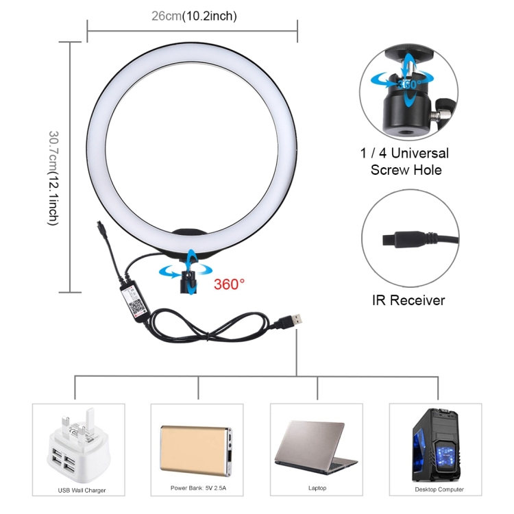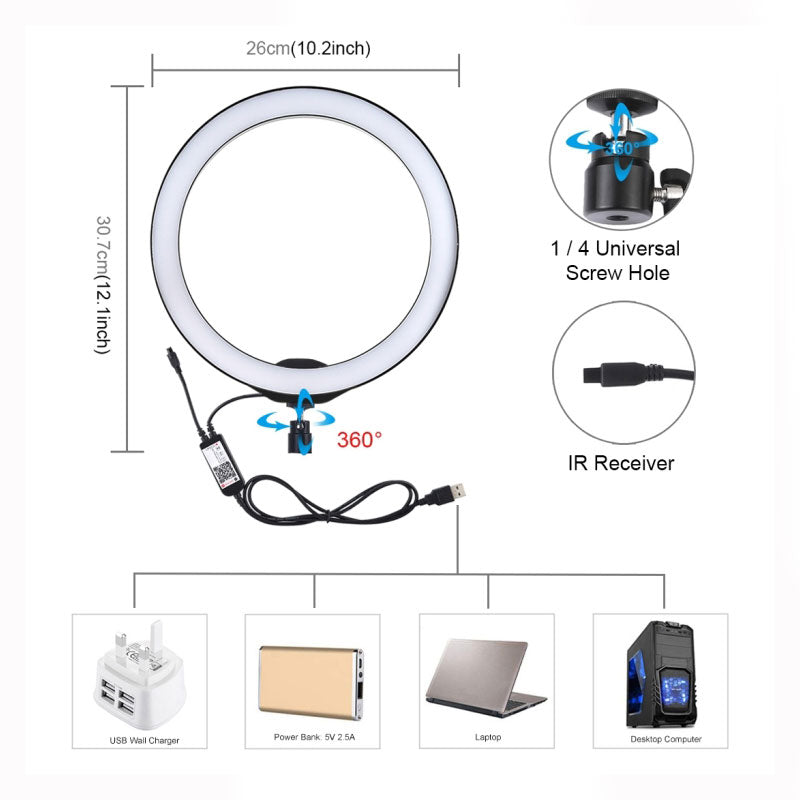 1. LED ring light can be mounted on the holder and take it anywhere, it can also be removed from the stand at any time, the tripod ball head can 360 degree rotating can free to adjust to any angle (The holder is not included).