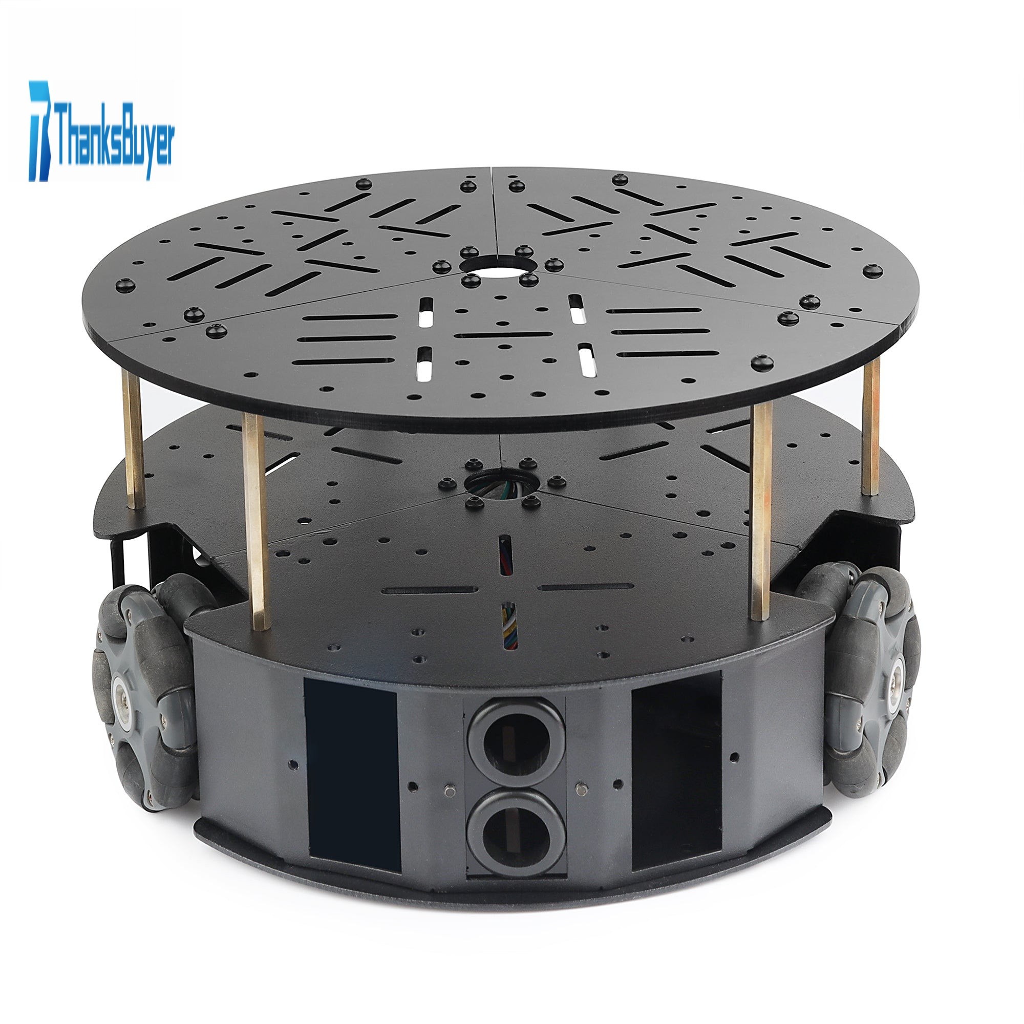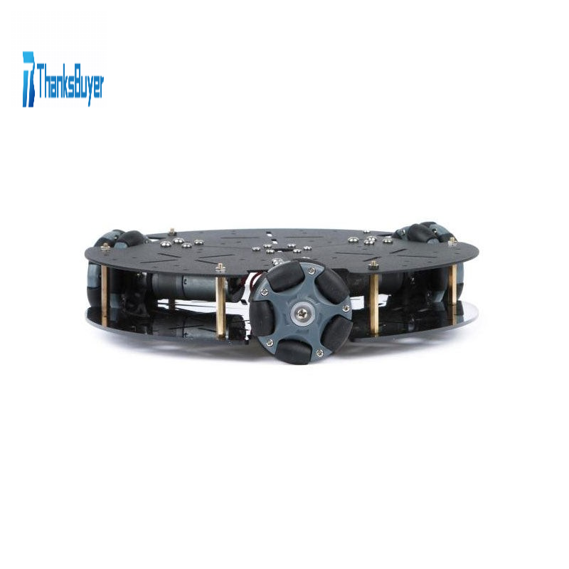The three-wheel drive omnidirectional wheel platform uses omni wheels to achieve omnidirectional movement, including longitudinal movement and lateral movement. It is a double-tier platform, users can increase the number of tiers freely, providing more space. For example, you can install electronic devices such as controllers, sensors, cameras, etc. Suitable for DIY. This is a very good omni wheel learning chassis.
