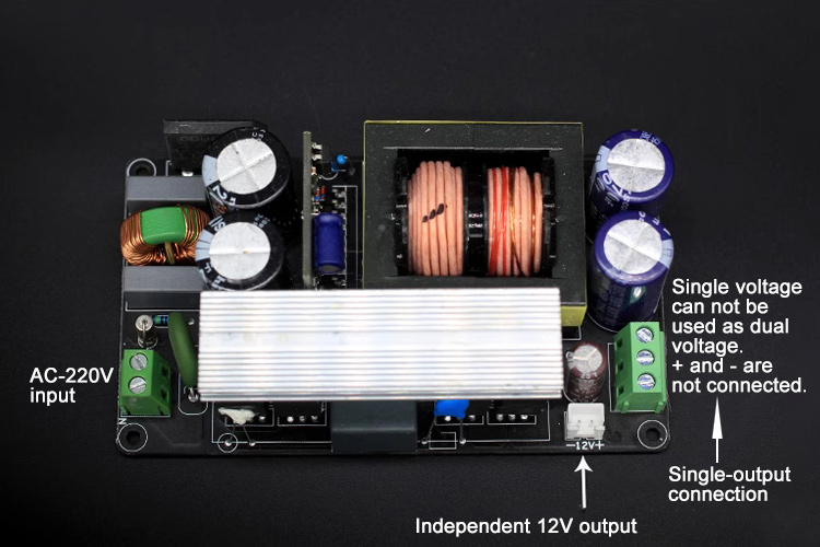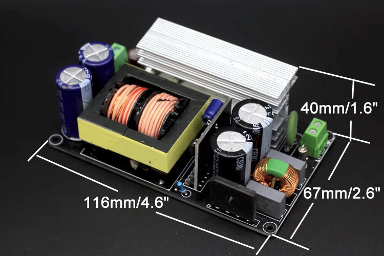 - When using this product with high power for a long time, please add a fan for air cooling. The power supply is protected against over-temperature, over-current and short circuit. The over-current and short-circuit protection is lock-up protection and the board must be disconnected from the AC power supply. Wait for the voltage of the main filter capacitor to drop to 0V before the board can be re-energized and started. This power supply is a real LLC power supply. And the resonant circuit is a high-frequency sine wave, not an ordinary square wave switching power supply. It is very suitable for power amplifiers because the board works well with them.