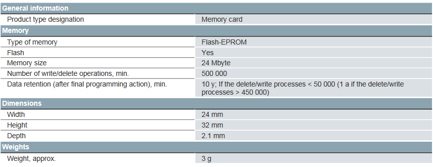 For SIMATIC S7, memory card for S7-1x 00 CPU/SINAMICS, 3, 3V Flash, 24MByte