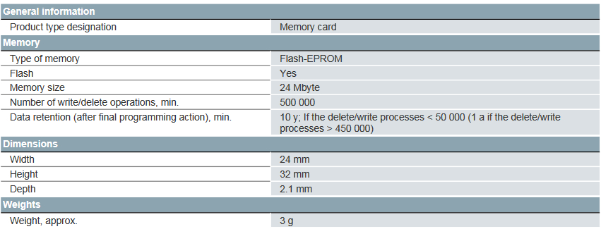 FOR SIMATIC S7, MEMORY CARD FOR S7-1X00 CPU/SINAMICS, 3, 3V FLASH, 24MBYTE