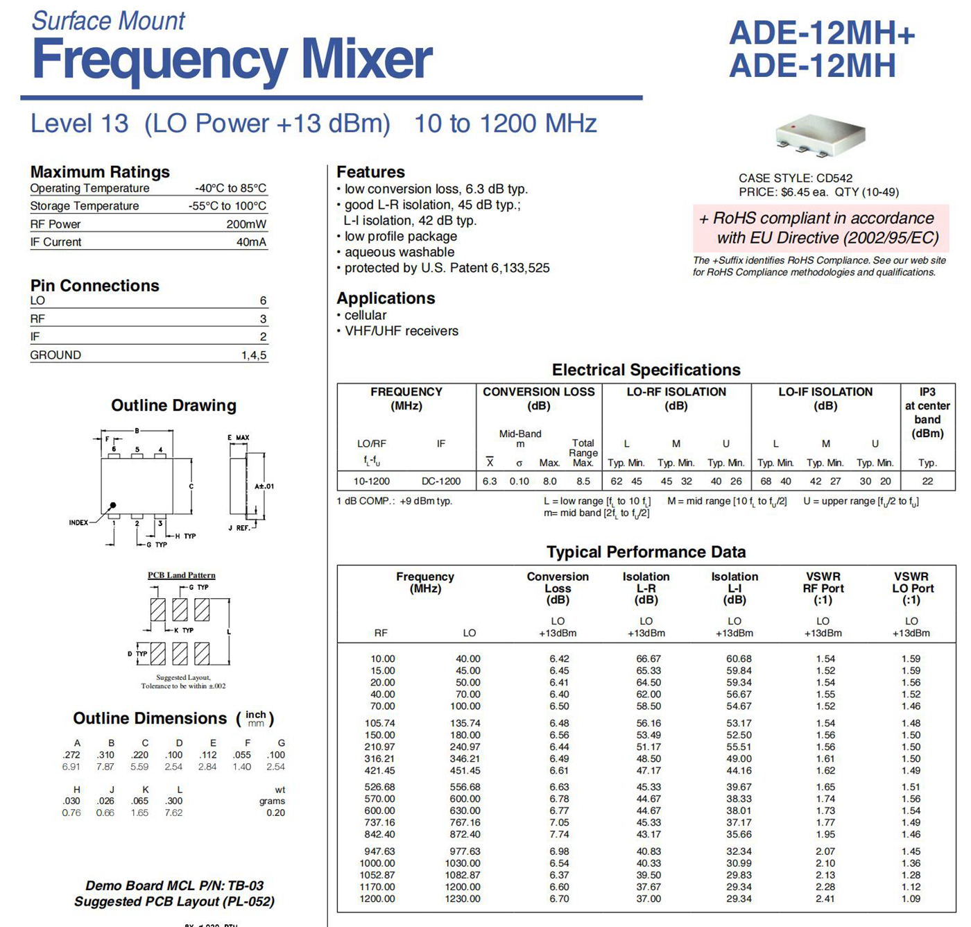 ADE-12 Passive Frequency Mixer 10-1200MHz RF Mixer Upconversion Downconversion SMA Connectors