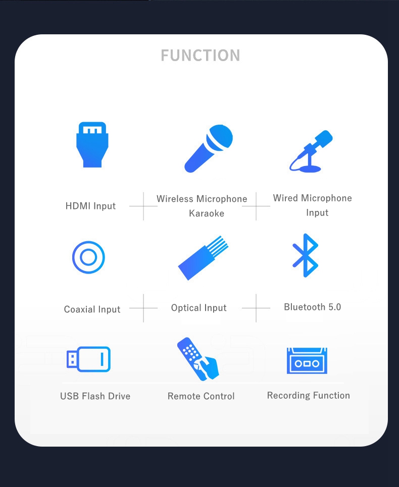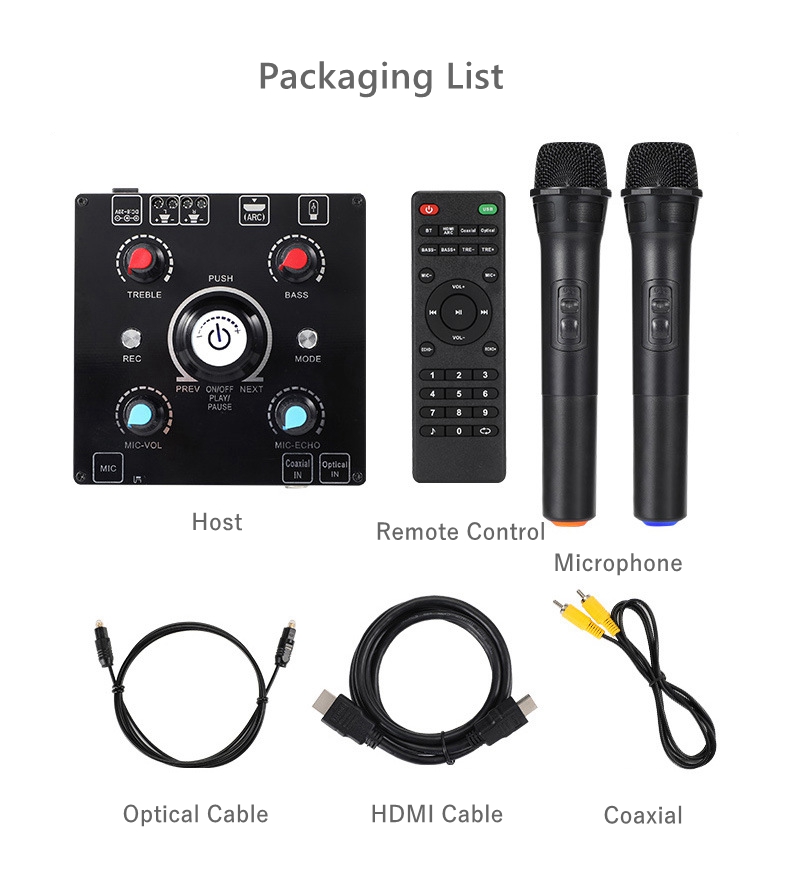 - Infrared remote control + wireless microphone + wireless Bluetooth play