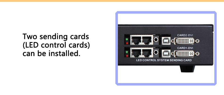 - Video Output Interface: It has 2 DVI video output. The 2 videos programmed output to LED sending card or display.