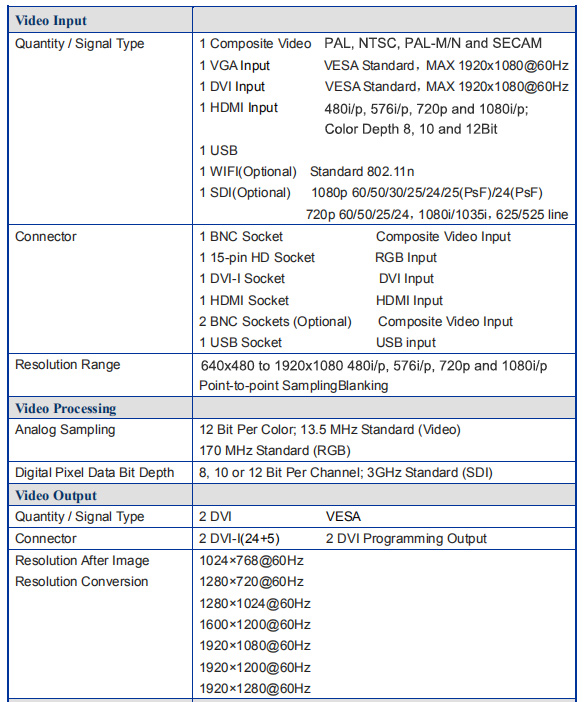 - 6-channel digital-analog video input: 1HDMI, 1DVI, 1VGA, 1AV and 1USB. If you need to add SDI port, WIFI control and remote control, please contact us or you can search
