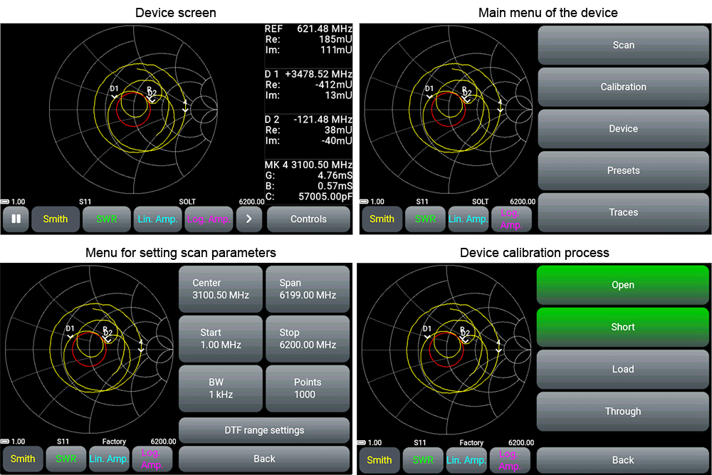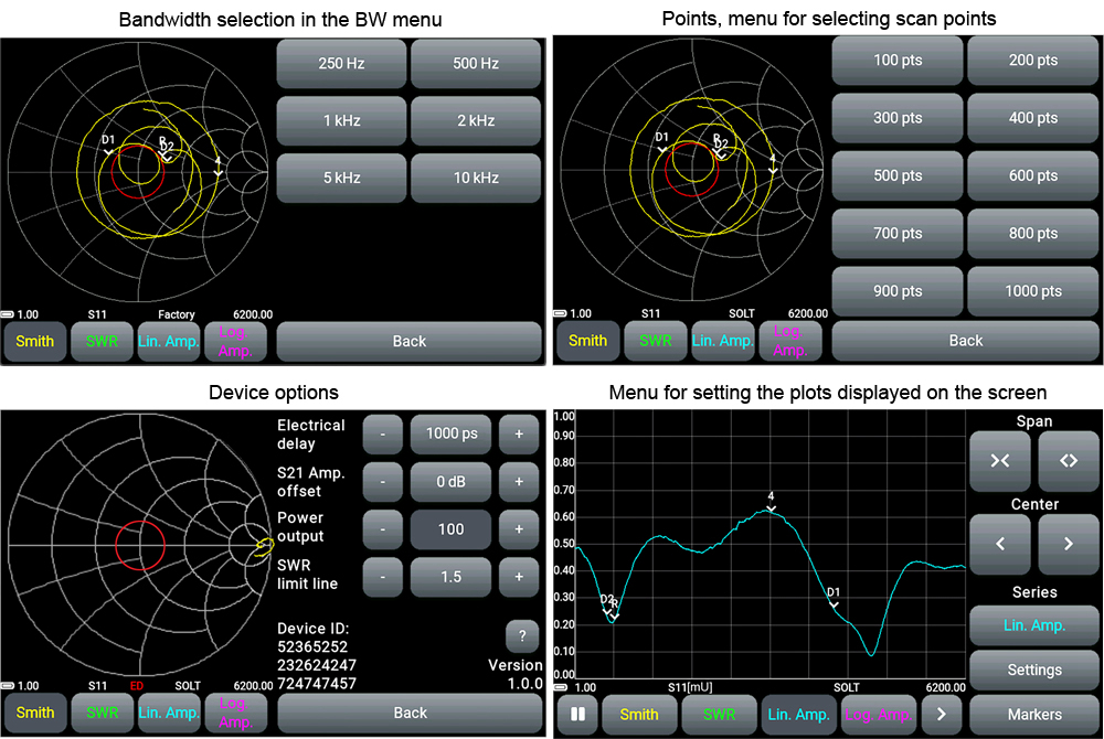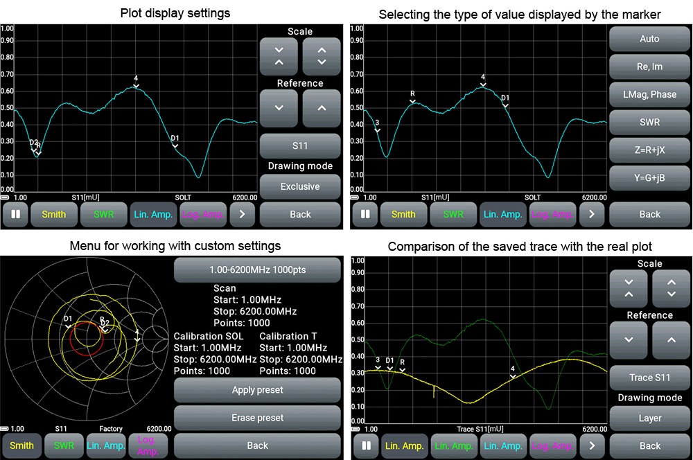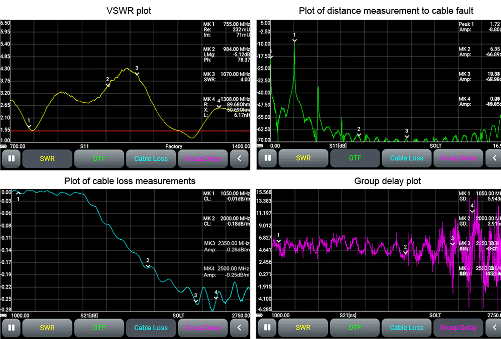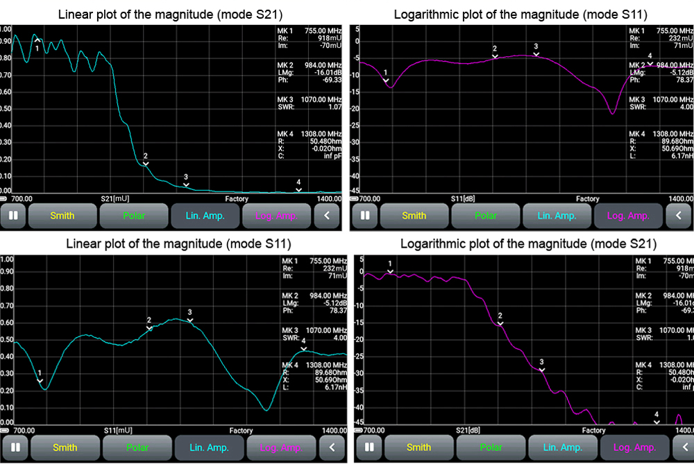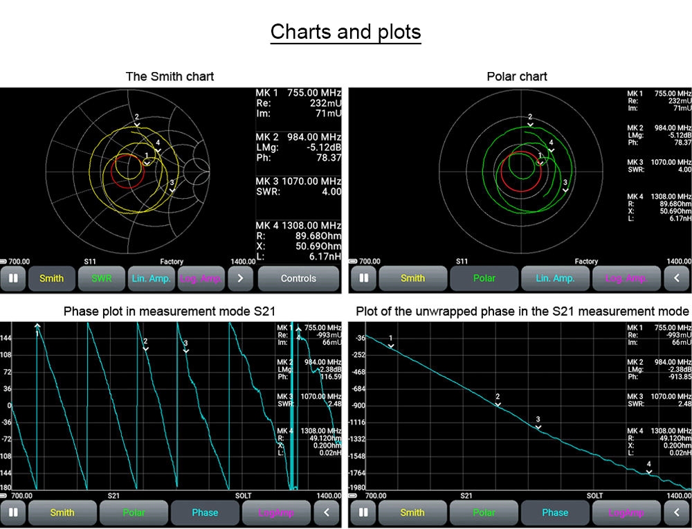 - Displayed charts: Smith chart; polar chart; phase of the reflection coefficient S11 and transmission coefficient S21 ; magnitude of S11 and S21; logarithmic magnitude of S11 and S21; SWR; distance to fault; cable loss, group delay