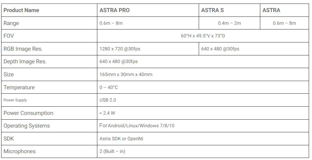 The Astra, Astra S and Astra Pro provide high-end responsiveness, depth measurement, smooth gradients and precise contours, as well as the ability to filter out low-quality depth pixels. The different versions provide developers with the freedom to fine-tune their needs with short range, long range, and high-resolution RGB camera options.