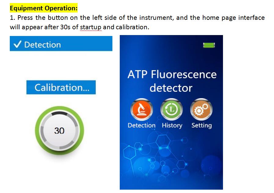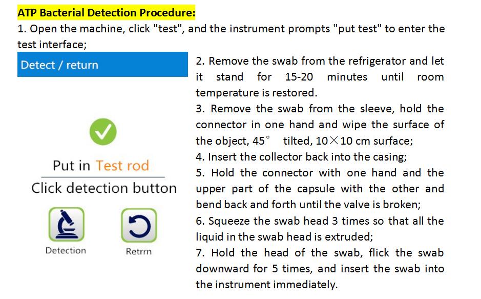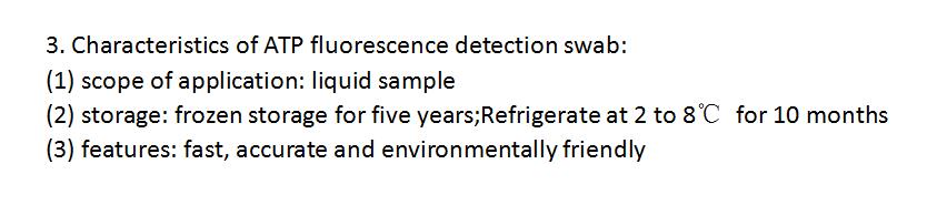 -The operation uses a biochemical reaction method to detect ATP content. The ATP fluorescence detector is based on the principle of firefly luminescence, and uses the "luciferase-fluorescein system" to rapidly detect adenosine triphosphate (ATP). The ATP swab contains a reagent that can lyse the cell membrane, can release the intracellular ATP, react with the specific enzyme contained in the reagent to generate light, and then use a fluorometer to detect the luminescence value, and the amount of the microorganism is proportional to the luminescence value. Since all living cells contain a constant amount of ATP, the ATP content clearly indicates how much microorganisms and other organisms remain in the sample and is used to determine hygienic conditions.