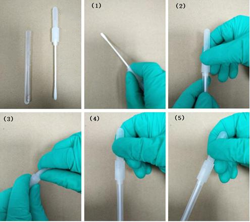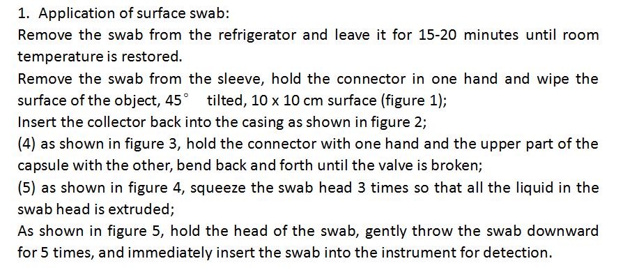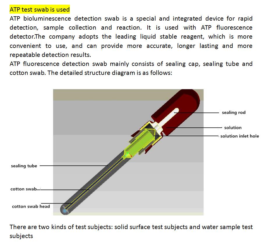 ATP content in living microorganisms is relatively constant.In this swab, ATP content is determined by detecting the luminescence value, thus determining the content of live microorganisms in the sample.The swab has two structures. The lower end of the connector of the surface swab is connected with a cotton swab. The cotton swab contains a bacterial lysate containing lytic bacteria and other microorganisms.The lower part of the connecting head of the water sample collector is connected with the pipet water sample collector, and the tube contains the bacteria lysate of lysed bacteria and other microorganisms.The swab head contains an enzyme reaction solution that emits light in response to ATP.The samples on the surface of the object are collected by cotton swabs or water sample collector to collect liquid samples. The samples interact with the bacteria lysate to release ATP in the microorganism, and then mix with the enzyme reaction fluid to produce reaction luminescence. The luminescence value can be read by the instrument.