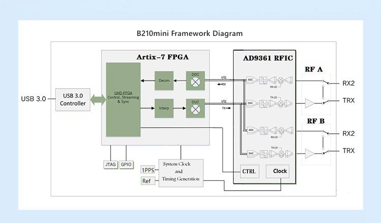 - B210 mini: A cost-effective software defined radio (SDR) experimental platform that is compatible with Ettus Research B210 and uses UHD drivers to maximize compatibility with existing software and development platforms.