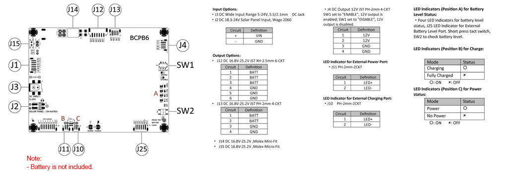 - BCPB6 is a highly reliable Lithium-Ion Battery Charging, Protection, and Balancing Board that operates with wide input range, 5- 24V. This board is able to charge the batteries from input voltages above, below, or equal to the output voltages. It is designed for 6 in series 21700 Lithium-Ion Battery which provides approximately 88-100Wh energy. For the MPPT charging integrated feature supports an 18.3-24V power supply. BCPB6 is complemented with a visualized display of battery level indicators. To ensure the reliability of this board, it is equipped with full protection circuit; overcurrent, over-temperature, short circuit, and over/under voltage protection. The battery balancing IC allows constant battery voltage between 6 in series 21700 Lithium-Ion cells. It is designed for industrial application with verified MTBF for low-temperature increment under rigorous design.