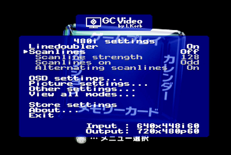 Using the remote control, you can access the additional features by pressing 'Menu' and swiping through the options using the arrow keys. There are a variety of changeable features, such as the ability to 'Line Double' and add scan lines for your preferred appearance. The main purpose of the 'Line Doubler' feature which can be accessed by pressing Menu and turning 'Linedoubler' on will be to upscale your games. For example, 240p can be line doubled to 480p. This translates to a much clearer and crisper image. This is shown in the picture below: