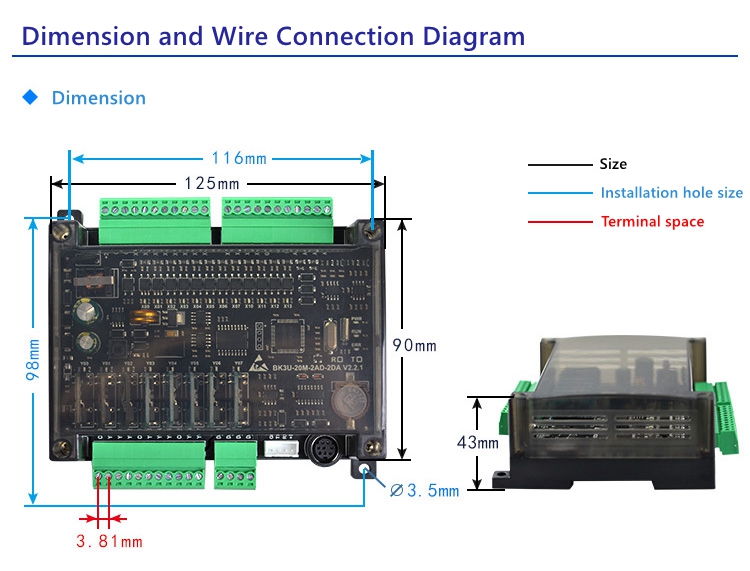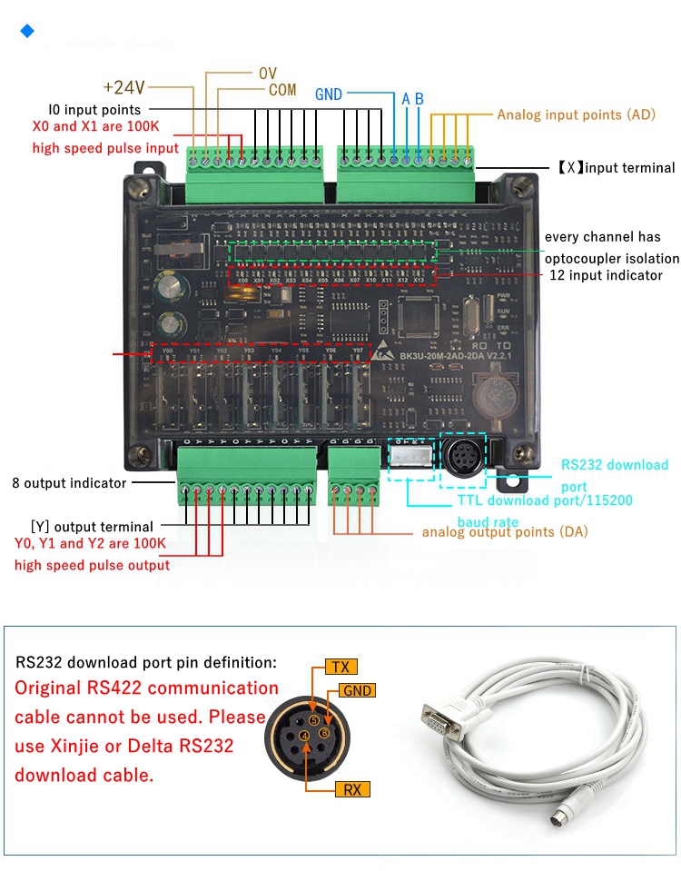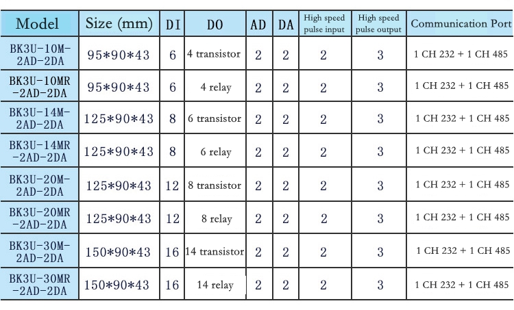 - It adopts transistor 12 point DI input - 8 point DO output and analog quantity 2AD input - 2DA output