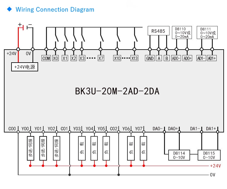 - 16Bit special use (AD): AD0 = D8110; AD1 = D8111 (0 ~ 10V is correspond to 0 ~ 2000 at M8115 position by default, 0 ~ 10V is correspond to 0 ~ 4000)