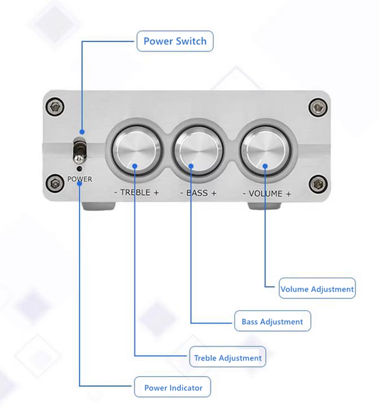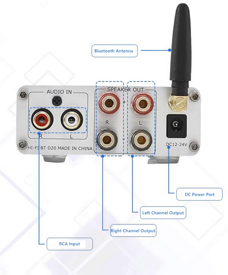 - D100B built-in 2 pieces of TPA3116D2 digital chip, output power up to 100w per channel, and it has a tone function, whose low frequency is powerful, treble transparent is bright, support Bluetooth 5.0.