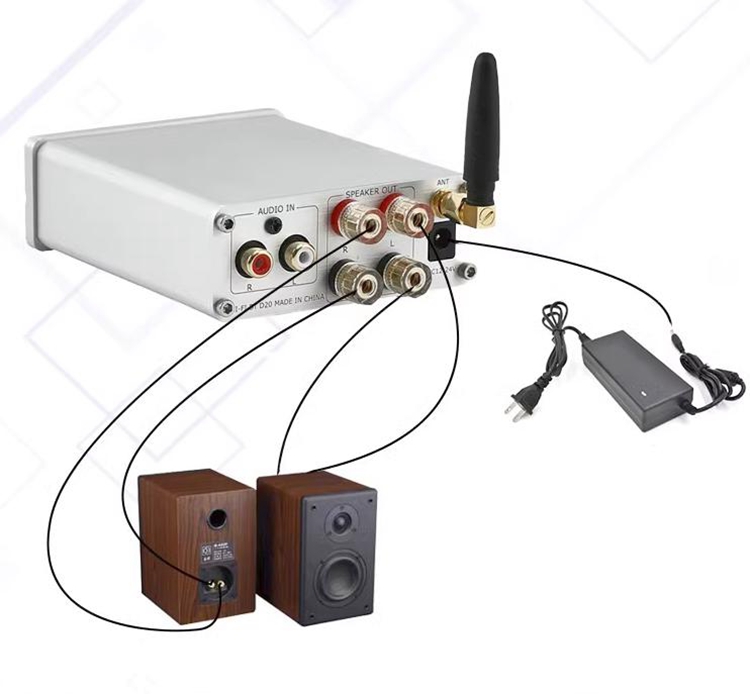 - D100B use DC12-24V power supply, the higher the voltage, the higher the power, but it can not exceed 24V, otherwise it will burn the amplifier, power plug 5.5 x 2.5, inside positive and outside negative.