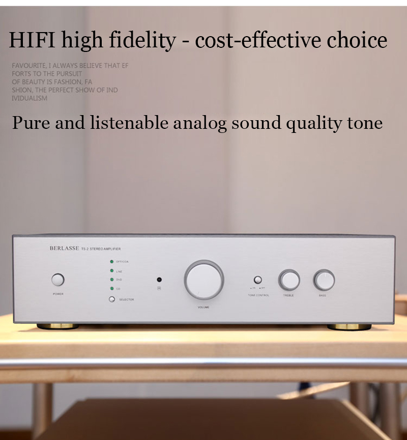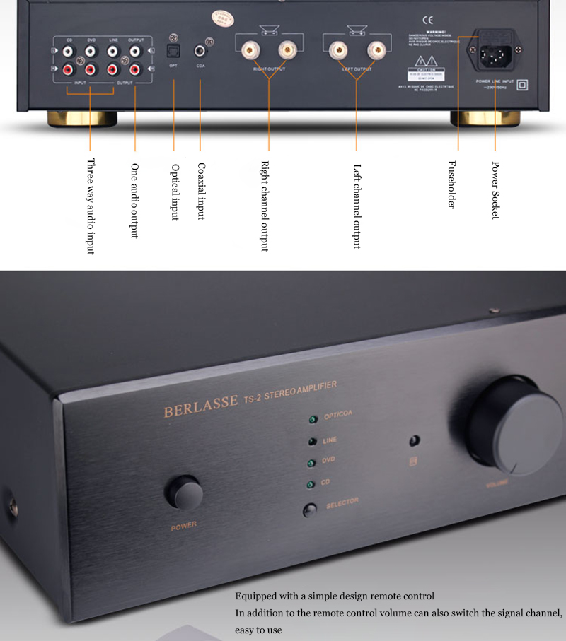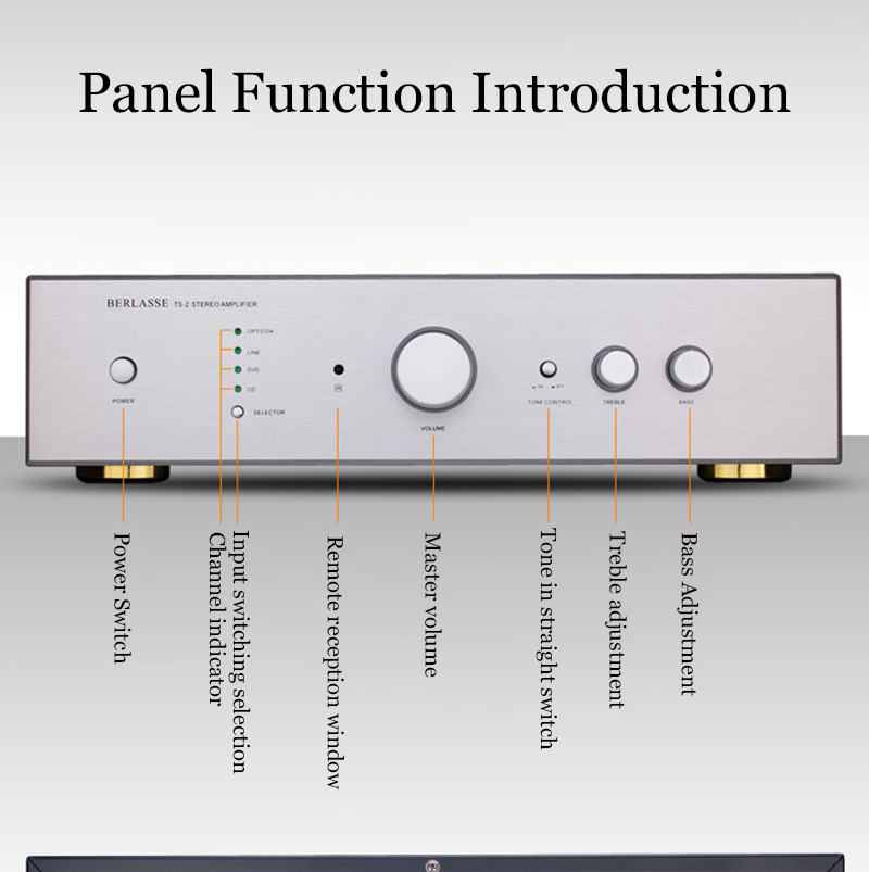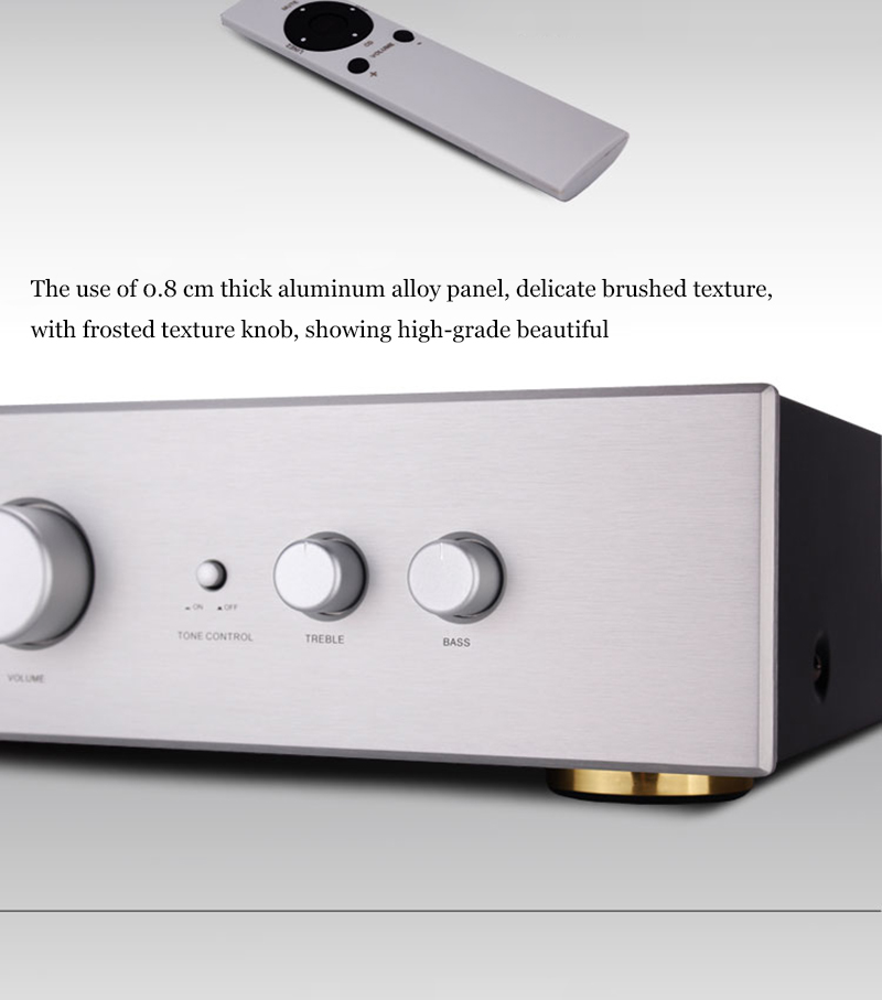 - The main volume adopts mechanical motor potentiometer and manual treble and bass adjustment. The main volume is equipped with a remote control to control the volume and switch the four gear audio input, which is convenient to use.