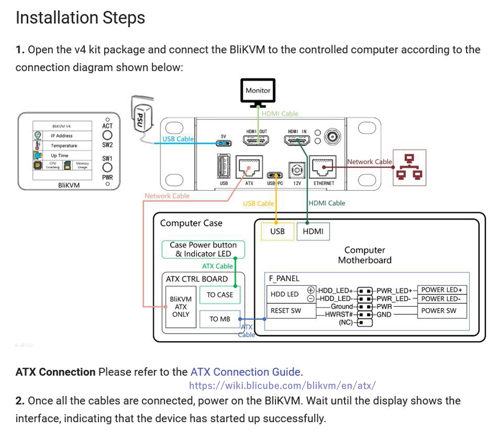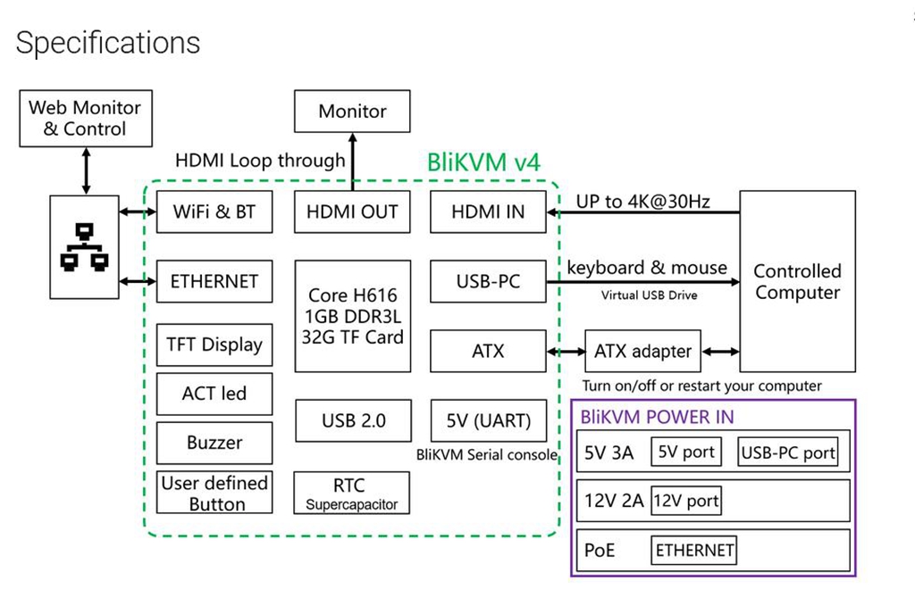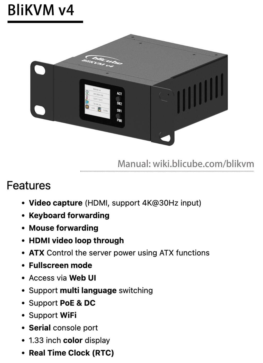 - BliKVM v4 is a production-ready, plug and play KVM-over-IP device that offers professional users a convenient solution for remote server or workstation management. It is based on Linux and fully open source. With BliKVM, you can easily power on/off, restart your computer, configure UEFI/BIOS settings, and perform OS reinstallation using an emulated Mass Storage Device. BliKVM simulates a keyboard, mouse, and monitor, all accessible through a web browser, ensuring a seamless user experience. Its hardware-level access guarantees independence from specific remote ports, protocols, or services, making it a highly flexible and reliable remote management solution for professionals.