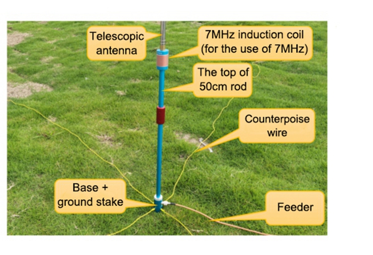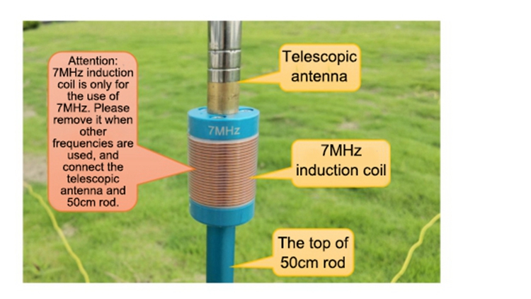 - Step 3: Screw the 7MHz induction coil into the upper end of the 50cm rod, and then screw telescopic antenna into the 7MHz induction coil. The coil is only required for 7MHz. When using other frequencies, please remove the coil.
