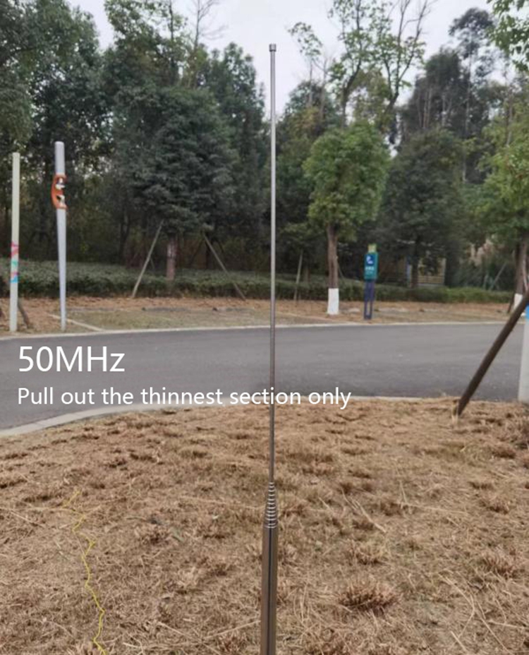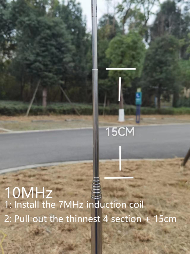 - Step 4: Pull out the telescopic antenna section by section. For example: when using 7MHz, install the 7MHz induction coil between the telescopic antenna and the 50cm rod. Pull the telescopic antenna upwards section by section until it is pulled to a position near the 7MHz character. Due to the influence of the environment, users need to make some minor adjustments, because the use effect of the lettering is not necessarily the best. When using 14MHz, the 7MHz induction coil can not be installed. Pull out the antenna section by section until it stops near the 14MHz position.