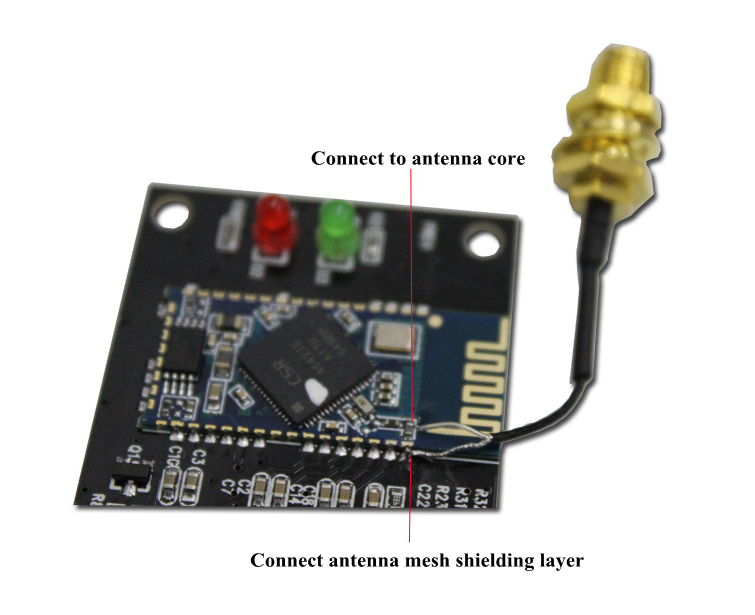 ⑤ The on-board Bluetooth antenna is used to receive signals and keep it open and unobstructed. If the module is installed in a metal chassis, an external antenna (2.4G antenna like router) is required to ensure complete signal reception. If you use a plastic shell or a wooden shell, you don't need an external antenna. Refer to the figure below for external antenna connection.