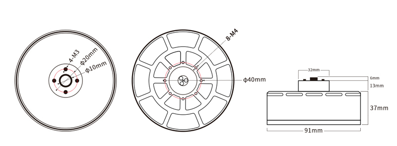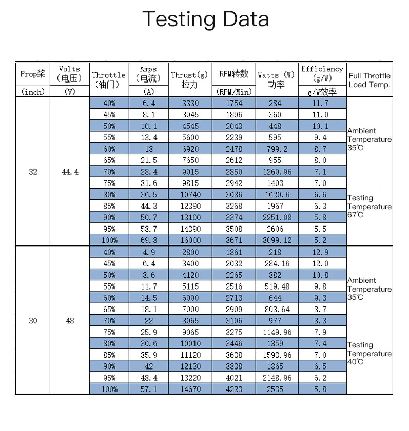 - For 32" propeller 44.4V: 6-12KG take-off weight for single axis