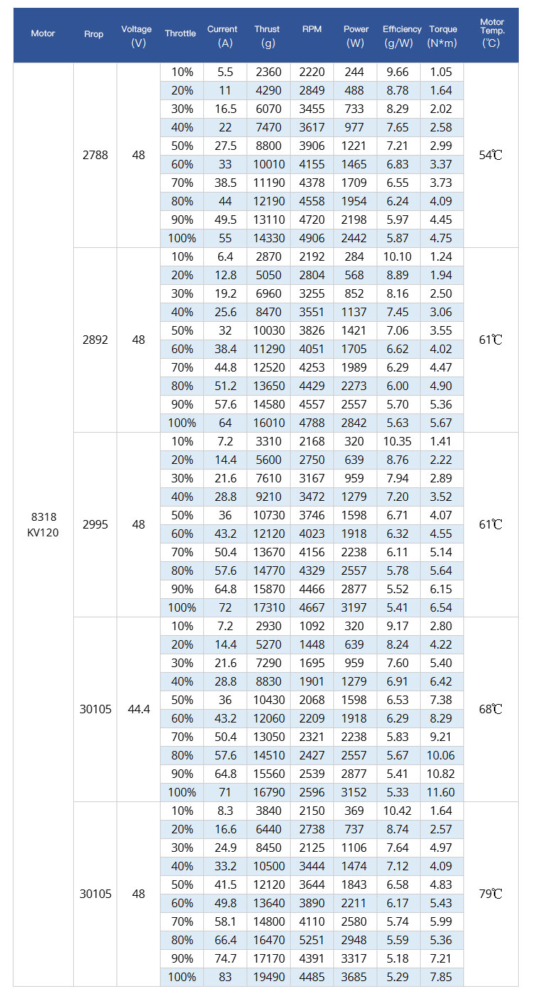 - For 30" propeller 48V: 4-12KG take-off weight for single axis