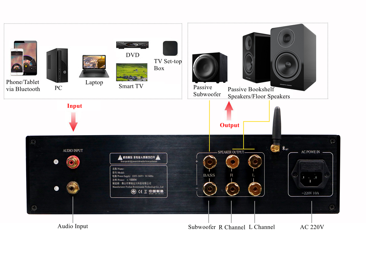 - Audio input: Stereo RCA/Bluetooth 5.0/U disk/SD card