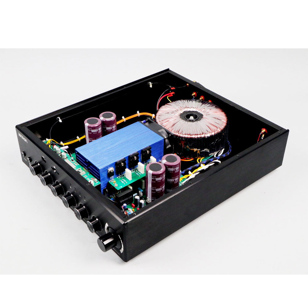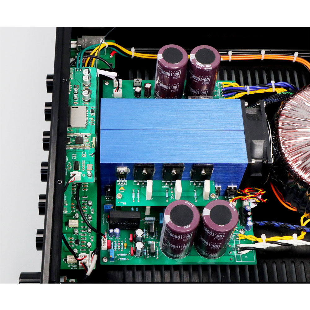 The total output is up to 1000W, left and right 200Wx2, the subwoofer is 600W, and it is equipped with a 1000W toroidal transformer. The left and right channels are STK412-440 modules for SANYO. Its vocals are better than that of digital amplifiers. The subwoofer uses 3 pairs of paired transistors with a maximum output of 40A, which can drive 10-15" subwoofers.