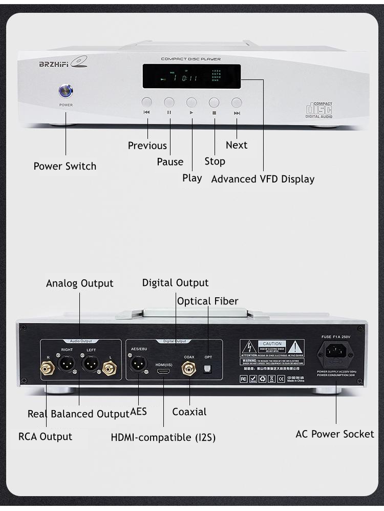 BRZHIFI CD100 CD Player Balanced Output Audio Player Decoding Digital Turntable High Quality Servo System for Philips