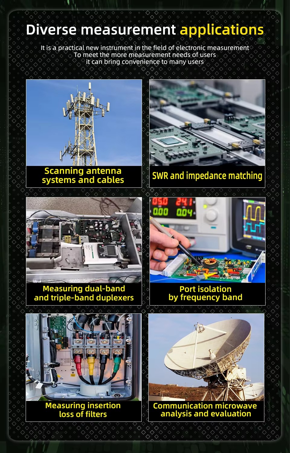 * Measurement Range: 70 dB (50 kHz - 300 MHz) / 60 dB (300 - 900 MHz) / 40 dB (0.9 GHz - 1.5 GHz)