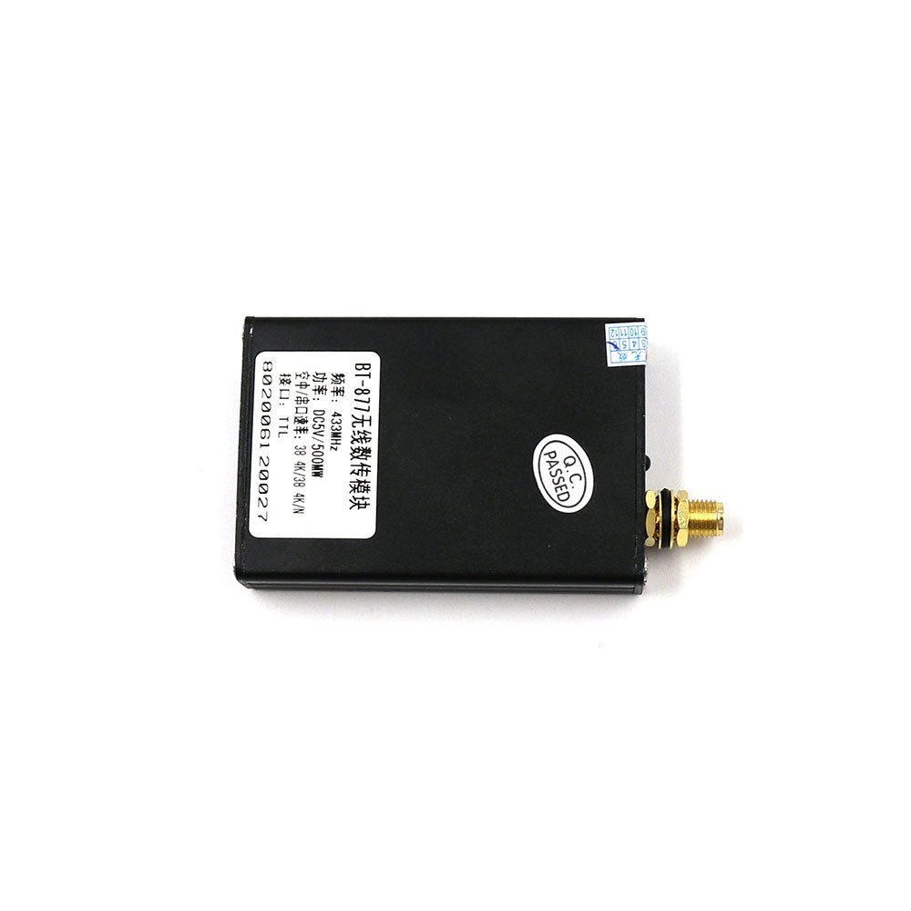 - BT-877 wireless data transmission module, using ISM frequency band operating frequency: 16 communication channels can be set, the transmission power is 500mW (27dB), high receiving sensitivity: -123dbm, volume: 63mm x 43mm x 15mm (excluding antenna base). The charging system is very convenient for users to make embedded wireless systems.
